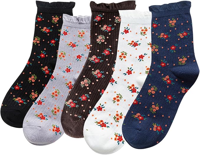 5 Pairs Women Flower Pattern Ankle Socks Thin Cotton Cottagecore Casual Crew Socks Vintage Novelty Dress Socks