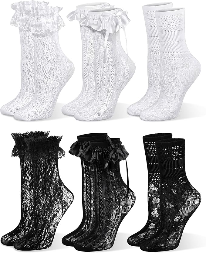 6 Pairs Lace Ruffle Socks for Women Girls, White Black Frilly Ankle Socks with Bow Lace Trim Lolita Casual Crew Socks