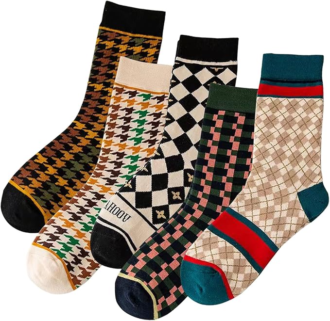 5 Pairs Cotton Crew Socks for Women Plaid & Striped Casual Dress Socks Vintage Cozy Socks Fun Ankle Boot Socks