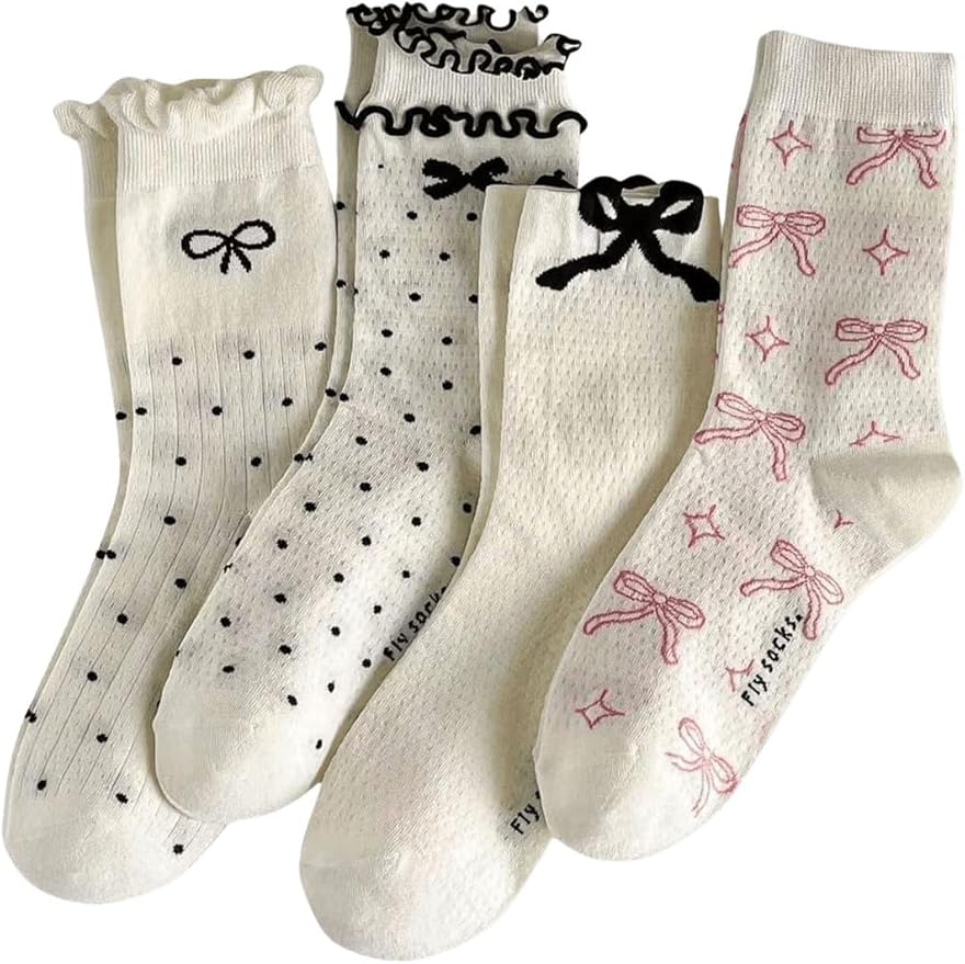 Women's 4 Pairs Frilly Socks Bow Polka Dots Lettuce Trim Crew Socks Kawaii Cute Socks